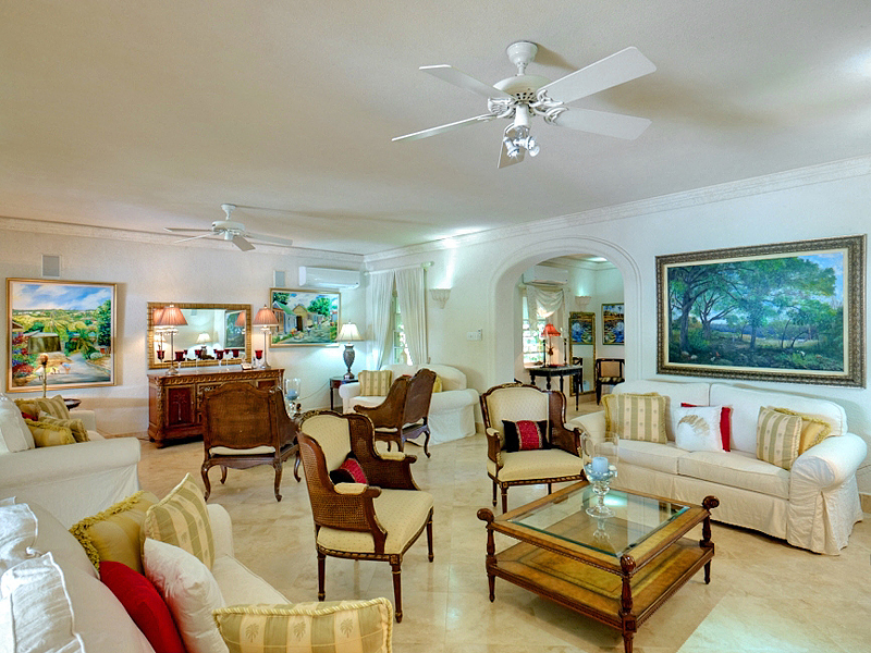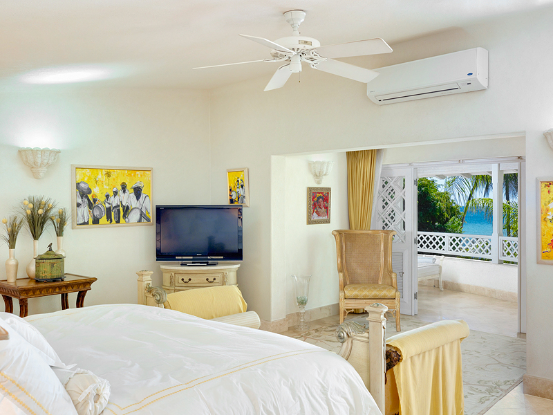 The interior of the spacious two-level villa home has been beautifully renovated, featuring coral-stone walls, marble flooring, high-end furnishings and local Caribbean artwork. The living room leads out to the terrace and offers elegant sofas and armchairs as well as tasteful home accents. Bright and modern, the fully equipped kitchen boasts custom-designed cabinets, a dining table with seating for 10 and is fully air conditioned.